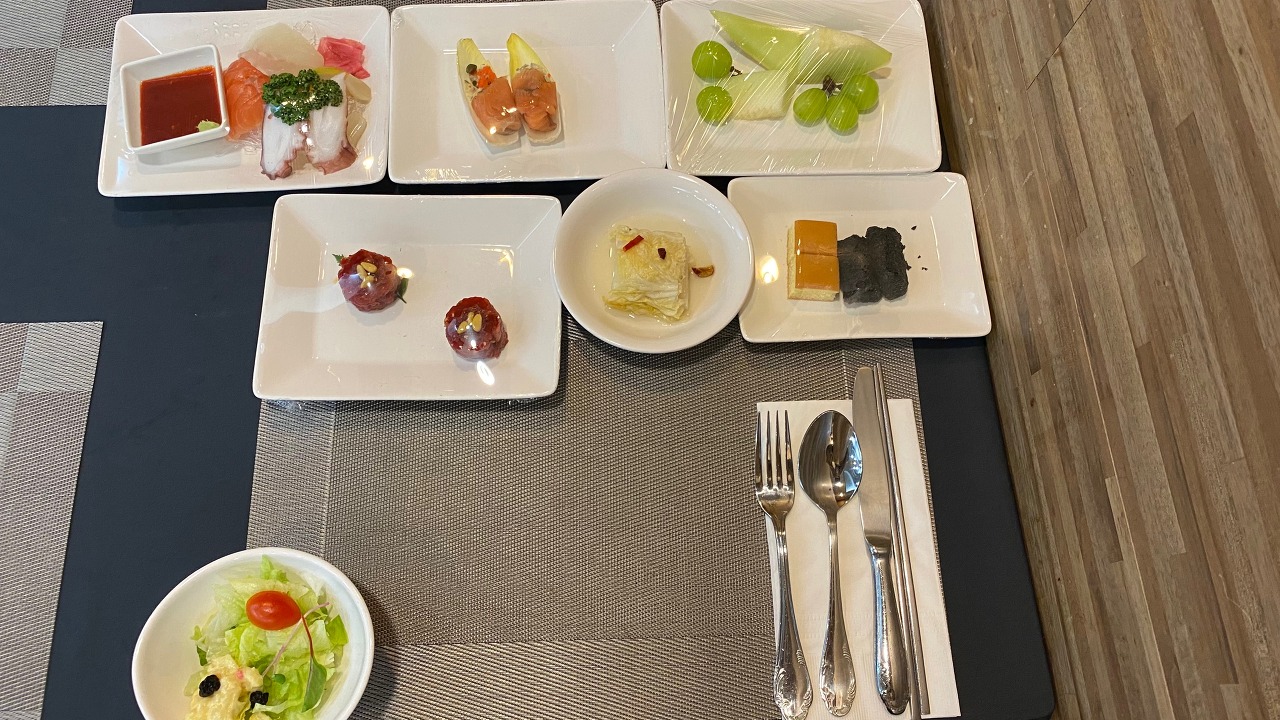 각종 회, 훈제연어, 과일, 육회, 백김치, 디저트류, 샐러드 입니다